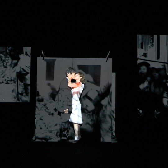 Cinquante ans après ce qui fut d’abord un scénario pour Alain Resnais, écrit par Marguerite Duras en 1958 et tourné un an plus tard, Christine Letailleur met en scène le texte intégral de ce drame sentimental. Hiroshima mon amour, c’est l’histoire d’un bref adultère, celui d’une actrice française, mariée et mère de famille, venue au Japon, à Hiroshima, pour tourner dans un film sur la paix, et d’un architecte japonais, également marié et père de famille, quatorze ans après la bombe atomique et la Libération. Ils se sont rencontrés, on ne sait comment ni dans quelles circonstances. Ils sont maintenant amants et se sépareront dans 24 heures.