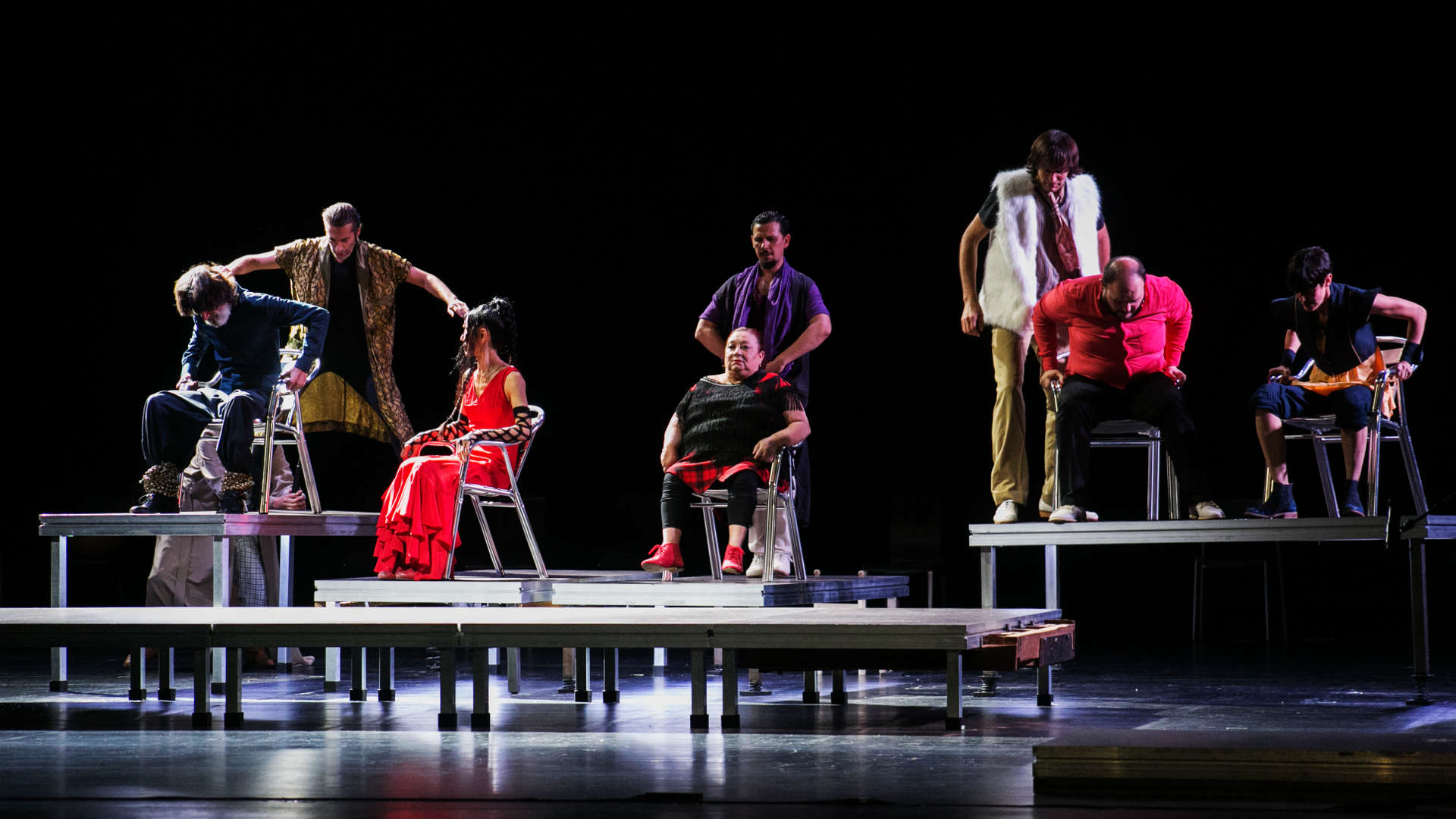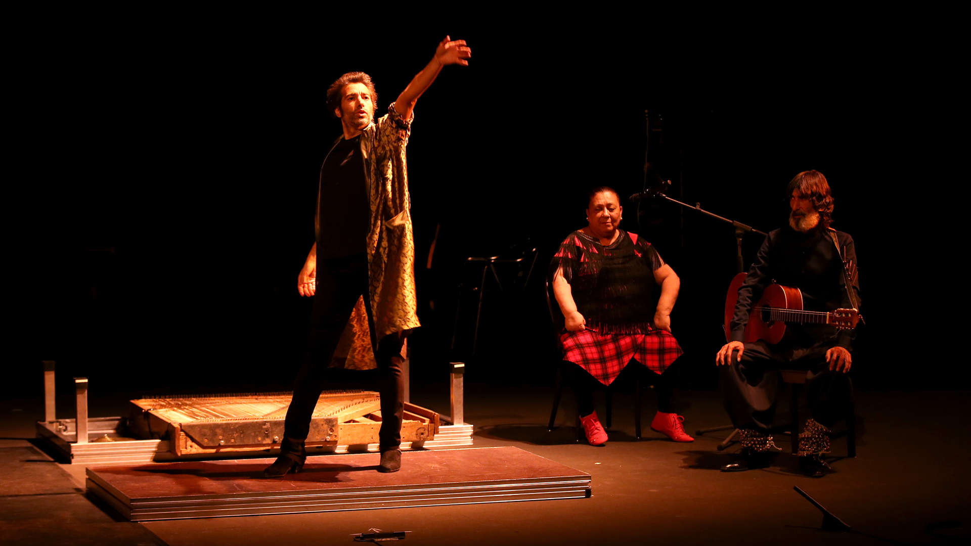 Au pied du (grand) mur, Galvàn risque tout. Tables à danser, chaises, micros, une ou deux guitares : le décor est minimal. Le chanteur Niño de Elche entre au début et assoit sa rondeur sur une chaise. Il a du coffre. Il ouvre le bal par un cri suspendu et toujours renouvelé. Personne sur scène, mais un raffut métallique dans les gradins. Galvàn commence, et pas là où on l’attend… Il arrive sur scène presque à reculons, s’y traînant comme un ver, mais fesses et dos contre terre, talons frappant comme d’habitude. Tout le corps frissonnant d’un « zapateado » complet ! Autour de lui, de solides personnalités dessinent des silhouettes. Uchi en tête, petite grand-mère gitane à bottines rouges et à jupe écossaise sous le gilet noir à franges. Quand elle danse, à pas microscopiques et à voltes de mains minuscules, le flamenco surgit jusqu’aux racines. On reconnaît El Caracafé, grand maigre à la guitare qui enverra plus tard à Galvàn ses notes d’un geste dansé. Deux compères en survêtement stimulent de leurs bottes les tables de métal tels des ados prêts à en découdre. Tous se regardent tranquillement. Des pluies d’or leurs sont tombées dessus, le Tablao est fermé, les clients sont partis. Ils vont pouvoir se défier… Les séquences s’enchaînent comme autant de paris expérimentaux : manger des pop-corns, se mettre le saladier sur la tête et danser ensuite pour créer la plus curieuse des images. Chaos souvent apaisé par le chant parfois lyrique, parfois flamenco ou arabo-andalou d’Alia Sellami qui passe telle l’ombre d’une fée. Ou par le choeur de polyphonies byzantines assis au premier rang qui impose sa pause spirituelle...