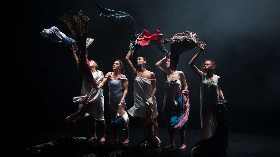 Pour seule musique, les respirations des danseuses en résonance avec chaque mouvement. « Le souffle est ici chargé d’un sens dramaturgique fort et fait entendre l’intime, il rend ce territoire palpable », raconte la chorégraphe. Avec grâce et poésie, les corps vacillent, chutent, se relèvent, s’élèvent et se répondent, animés d’une urgence vitale et couronnés du salut des larmes, telles des étoiles fracassées. Les sanglots semblent conter ce qui fut brisé mais conservé, pour ne point perdre les morceaux de la beauté.