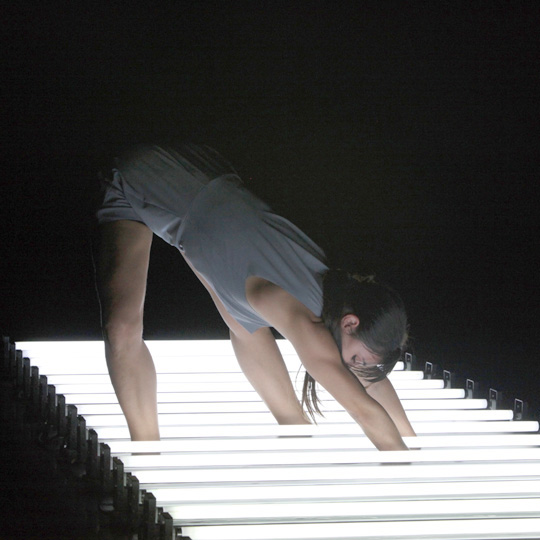 Obtus , dansée par Tamara Bacci, est une méditation gestuelle où la danseuse disparaît dans l’obscurité puis réapparaît derrière une ligne de lumière. Il y est question de temps et de retenue du souffle dans la suspension et dans la fluidité. Il y est question de tout ce qui s’oppose au bavardage. Le mouvement n’est plus à l’extérieur mais à l’intérieur de l’être.