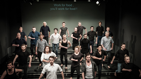 La voix du choeur de Requiemachine vise la réalité du système économique du libre-échange. Elle devient celle d’une société prise en étau entre la crainte du chômage et l’exigence de travailler au-delà de ses forces. Un choeur de performeurs se forme sur la scène du théâtre pour interpréter un requiem extatique contre ce système. Le livret est composé de textes des années 30 du poète Władysław Broniewski, d’extraits de discours, de lettres, de comptines d’enfant que le choeur confronte avec des théories philosophiques, ou encore le langage publicitaire. Prises dans les engrenages de la machine du choeur tournant à plein régime, la langue et la voix entrent en collision. La marche impériale de Star Wars se mêle au son d’une machine futuriste, au bruit de l’ordinateur, au chant réaliste-socialiste, au heavy metal. Sans concession, Marta Górnicka fait ressortir le totalitarisme des stratégies contemporaines de surveillance et de discipline.
