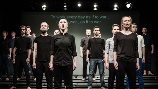 Un choeur de performeurs prend forme sur la scène du théâtre pour interpréter un requiem extatique contre
