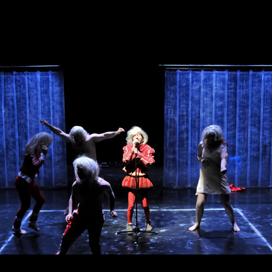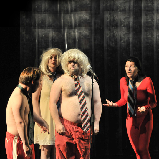 Sortir du corps est issu du travail du metteur en scène Cédric Orain avec les comédiens de la compagnie de l’Oiseau-Mouche sur les textes de Valère Novarina. Écriture gourmande et foisonnante, composée pour donner de la matière au corps, destinée à l’oralité et au théâtre, la langue de Novarina dévoile des influences de Rabelais et d’Artaud, mélange figures littéraires et argot. L’auteur met la langue à vif, utilisant des dialectes oubliés, le « latin animal, le grec de cirque, le patois en perdition ou les néologismes jaillissants ». La pièce démarre comme un excès de théâtre avec costumes d’époque. Cédric Orain s’attache, progressivement, à faire sortir la parole du corps des acteurs pour qui sont écrits ces textes impossibles, trop durs, trop longs, trop drôles.