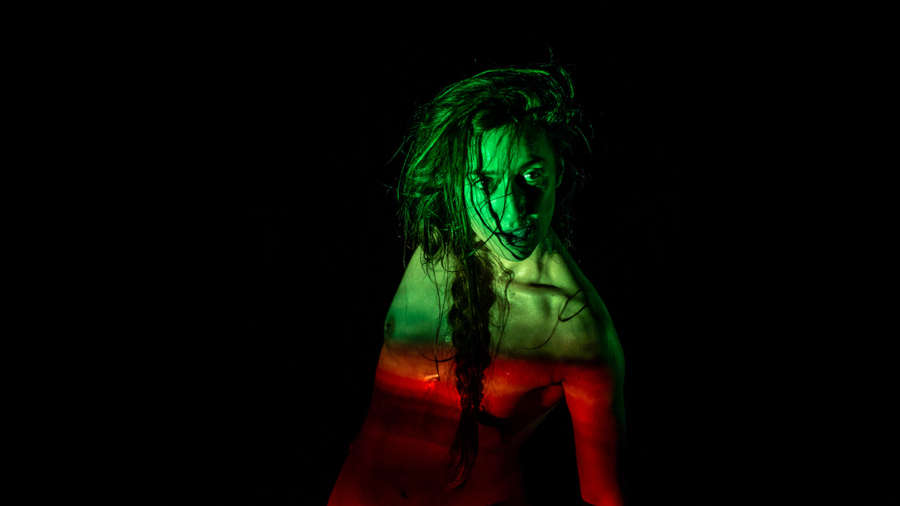 Derrière un voilage de gaze noire, cinq corps nus se dessinent. Statiques, ils sont assis par terre. Tous ont le regard perdu, dans le vide. Alors que le rideau se lève, leurs visages s’animent et grimacent, leurs mains, leurs bras, leurs jambes, puis leurs carcasses se meuvent imperceptiblement. D’étranges bruits sortent de leurs bouches venant se fondre dans les sons vibrants, bourdonnants et synthétiques imaginés par le compositeur italien Alessandro Cortini. S’accordant avec la montée en puissance de cette musique de plus en plus grisante, enivrante, leurs gestes deviennent robotiques, frénétiques, saccadés.