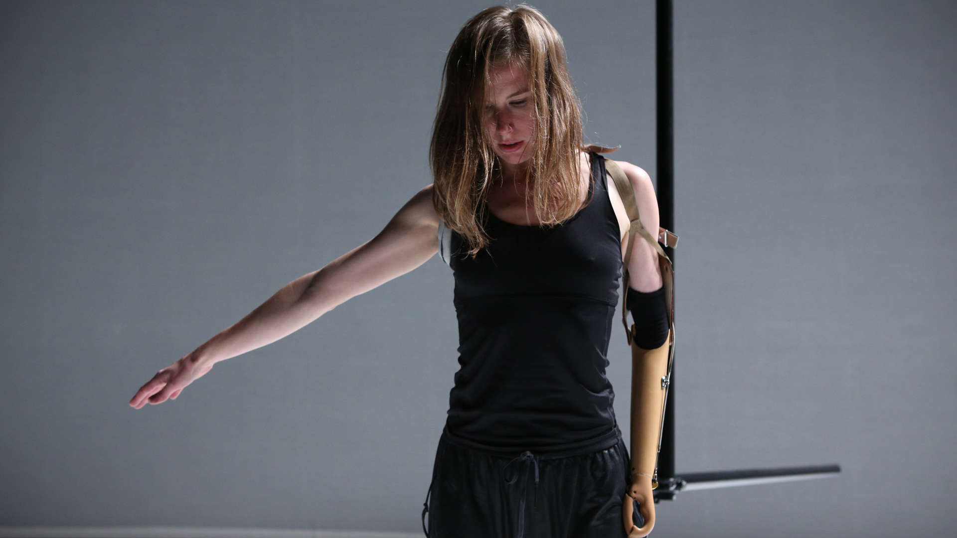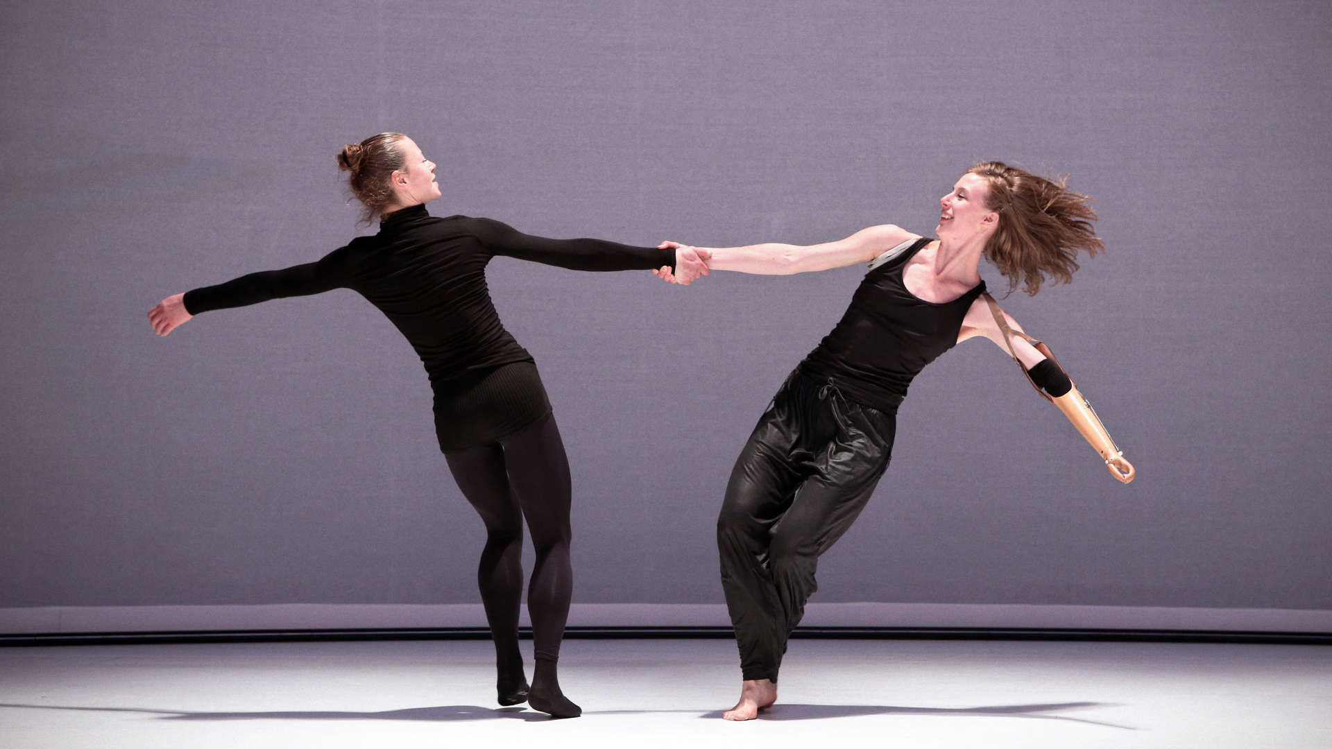 Atmosphère enveloppante et hypnotique, qualité d’écoute et de contemplation… Rachid Ouramdane parfait, dans Tordre, son art subtil de la composition et place la focale là où il sait le mieux la poser : entre étrangeté irréductible et proximité. Tordre s’ouvre malicieusement sur la musique de Funny Girl, le film musical américain de William Wyler. Deux danseuses déboulent sur le plateau. Avec elles, on sourit des grands archétypes du corps glorieux tel que Broadway l’a fantasmé. Pour mieux tordre, ensuite, la référence et pénétrer dans une autre histoire du corps, plus intime, plus fragile. C’est l’histoire de deux interprètes qui accompagnent depuis plusieurs années le travail de Rachid Ouramdane. L’histoire de la danseuse lituanienne Lora Juodkaite qui, en tournant sur elle-même jusqu’au vertige, a développé une pratique gestuelle personnelle qui l’accompagne et la réconforte depuis qu’elle est enfant. Et l’histoire de la danseuse britannique Annie Hanauer, bougeant avec une prothèse de bras articulée qui la prolonge et la constitue tout à la fois. Chacune à sa manière a développé un « savoir-faire » connu d’elle seule, a inventé une pratique devenue pour elle, aujourd’hui, consubstantielle.
