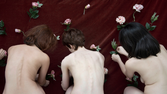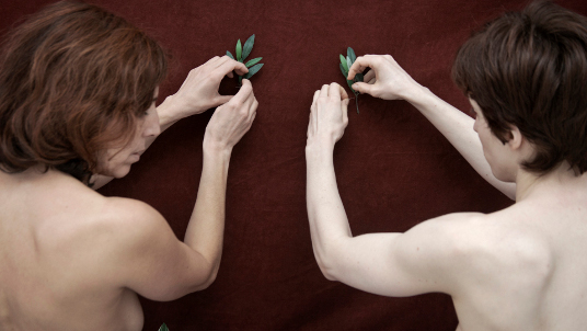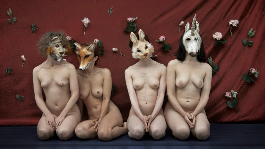 pour les quatre performers de dresser cinq tableaux en glissant dans la tapisserie - fleurs, bêtes, jeune